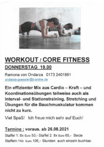 Das Kursangebot variiert immer wieder. Basis sind Core Fitness bei Ramona, Yoga bei Stefanie und Ute. Anmeldungen und Anfragen gehen bitte immer direkt an die Kursleiter. Sie sind unter Ansprechpartner für die Kursanmeldung weiter unten zu finden.